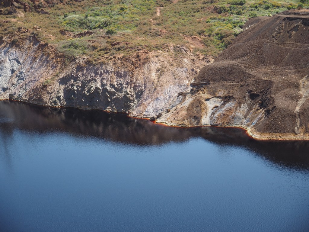 We amble up to the haunting Anglican cemetery, the photograph of the manager’s large family just labelled as English Family. Their faces stare out at us like a collection of Victorian ghosts. The old mine-shaft is filled with a strange blue coloured lake and the sheer rock sides are a poisonous copper green and iron red. Lead runs through it too.