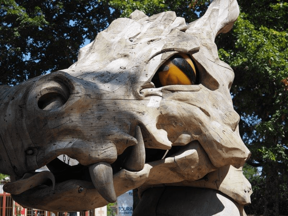There’s the dragon that’s leapt ‘out of the château’s walls’, with his gleaming yellow eye, and a foot poking out of his mouth.