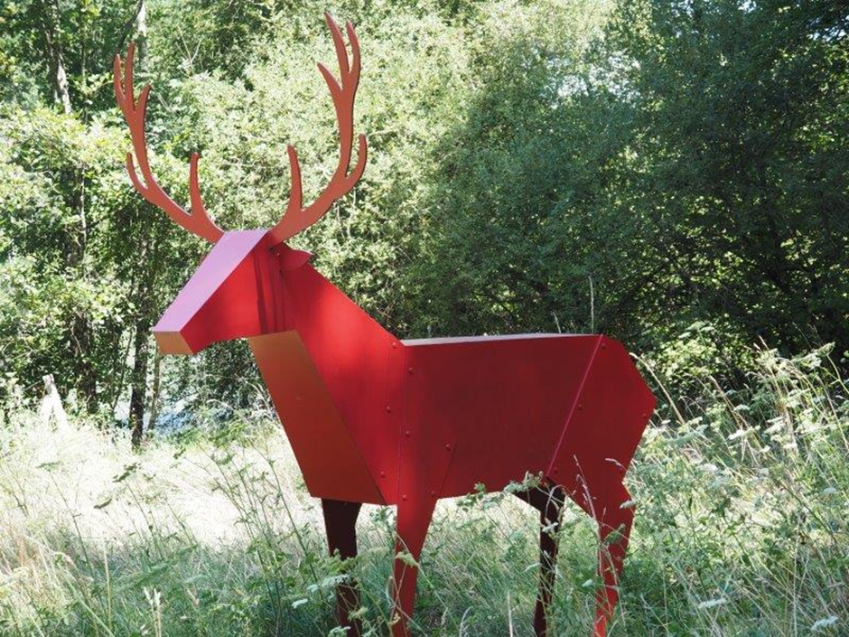 Tool men, fashioned from rusting metal, stand in the kitchen garden. A metal red deer and a wild boar stand in a meadow.
