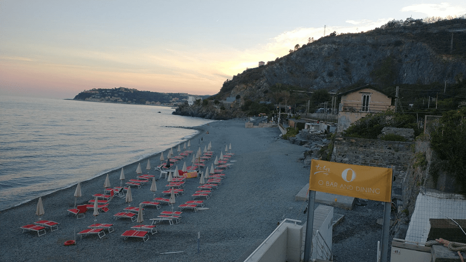 This ramshackle campsite is sandwiched between Liguria’s SS1 coast road and the railway line. Rugged cliffs hem in the small shingle beach, making it claustrophobic. The SS1 has a footpath but it’s so frantic with traffic I’ve no wish to ingest a year’s worth of exhaust fumes.