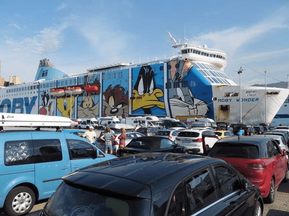 I wish our ship was still called the Princess Maria, but someone in Moby’s head office has decided to call it the Moby Dada. Coupled with that, the 40 year old ferry is painted with Looney Tune characters .