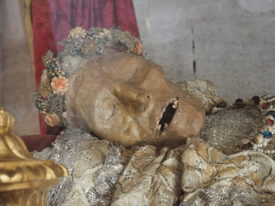 Serpents and wild animals guard the entrance on either side of the door. Inside it’s grace and light except for the mummified St. Flor, a Roman soldier and martyr, who grins at me, all gory teeth and gilded garments.