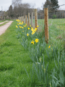 We camp at Highfield Farm in Topsham, on the Exe estuary. The daffodils are out in full force, the green rolling hills of Devon all around us.