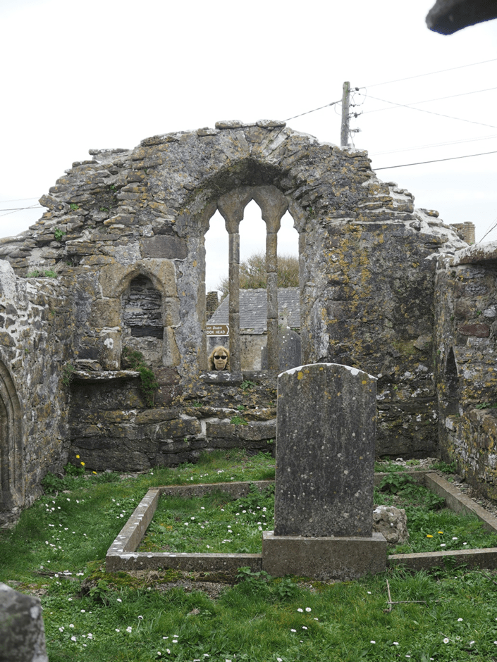 We walk to 5th century St. Dubhán’s church. Dubhán means fishing hook in old Irish, and the peninsula is shaped like a hook too. There’s not a soul in the ruins, the only sound birdsong.