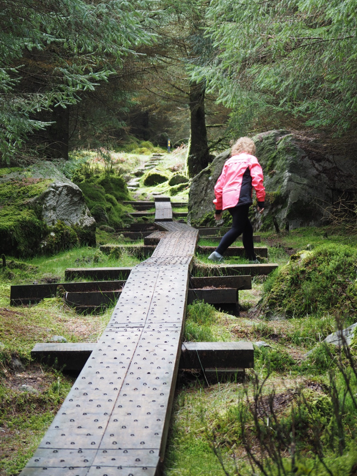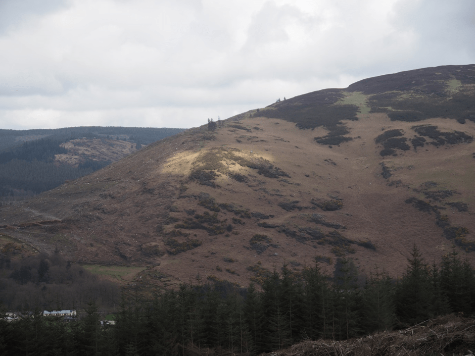 We’ve never walked the Wicklow Way south from here, so the next day, we tramp up the trail through forestry land. After zig-zagging up the mountain path, we’re surrounded by a bowl of fern covered mountains, the turf cutting bogs still marked out in rectangles on the hillside.