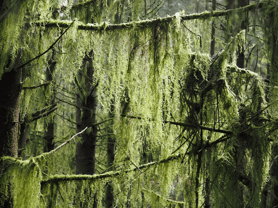 Following a railway sleeper path up through the water-filled forest, there’s so many different species of moss: star shaped, velvet cushions, sphagnum and, something I’ve never seen before, long flowing moss that hangs from the trees for all the world like the Spanish moss in the southern states of America.