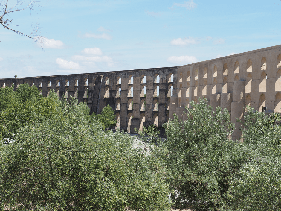 As often happens, we’re rewarded for our inept navigation. Before us is a triple floored, giant aqueduct. There’s a fort on the hillside and a white church in olive groves as well.