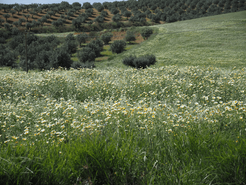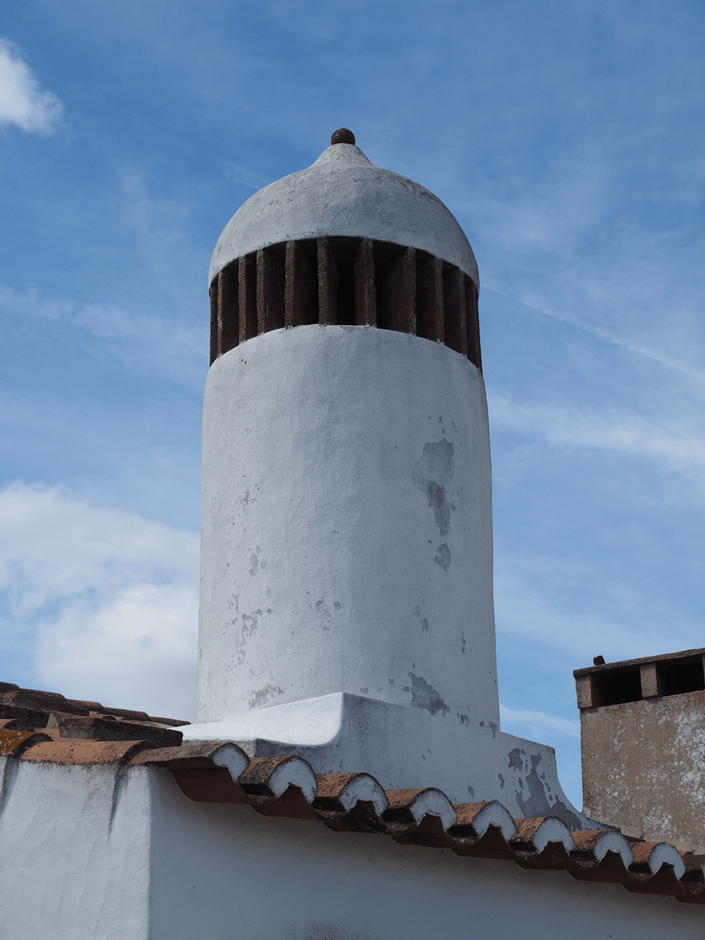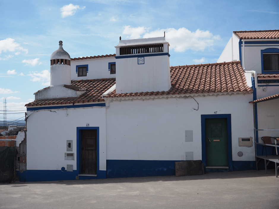 Seán squeezes the van down a cobbled village street in Juromenha. The squat white houses edged in primary colours, sport giant mushroom chimneys. Interested stares from drinkers on the bar’s terrace trace our progress. I don’t think many campers come this way. We park up by a vast field of chamomile, with the vivid blue of chicory on a hillside in the distance.