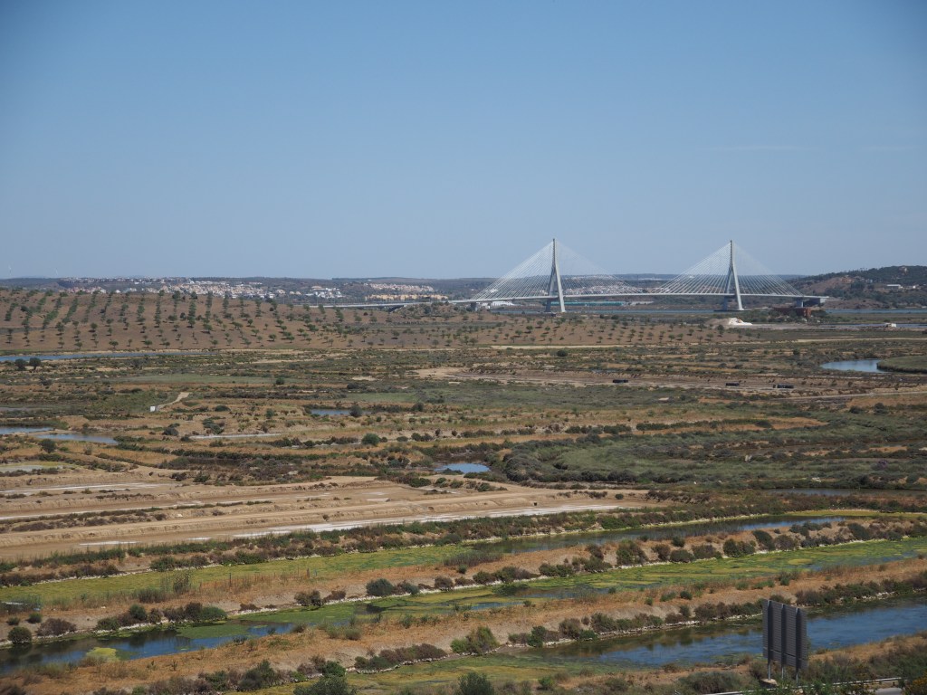 Driving along the IC27, the mountains are craggy in Portugal’s sunny south. We’re offered up glimpses of the wide and rambling River Guadiana between the mountains. Soon the graceful white suspension bridge into Spain rises up into the sky.