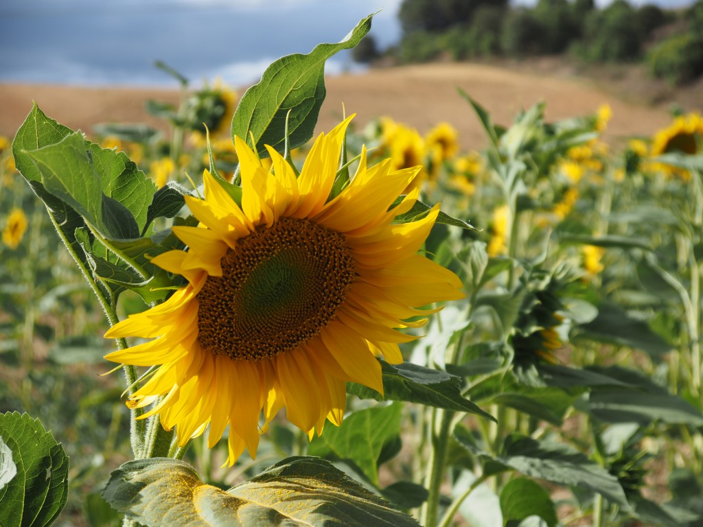 We walk through fields of sunflowers, their faces turned to the ruined San Cosme Chapel on an outcrop above the hamlet of Encio. The field is alive with sparrows dipping and feeding on the sunflower seeds. The track is lined with wild chicory, the last few remaining poppies, wild carrot and teasel heads – a feast for insects.