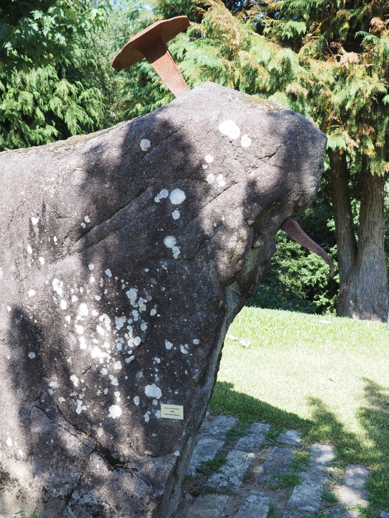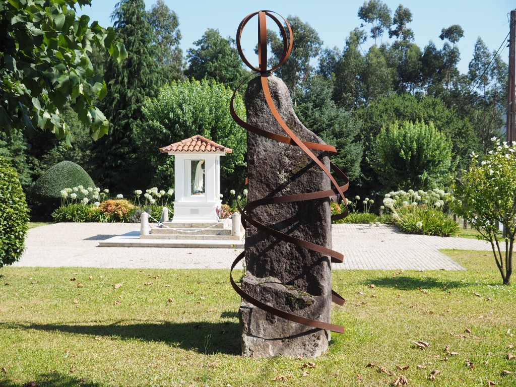 The little Agapanthas filled garden in Covas welcomes us, of course with a shrine to Our Lady of Fatima, but also on either side of her two sculptures. One is an enormous iron nail sticking out of a granite monolith, called Iron and Granite, symbolising these mountains.