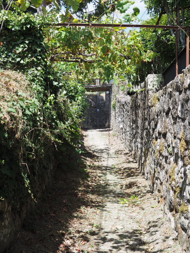 So it is that we have to retrace our steps, and follow the signs back to Covas, and I recover my equilibrium at the sights of the vine-tunnels over the paths lined by stout stone walls, kiwis scrambling over garden fences, hens pecking in the dust, vibrant purple morning glory and red roses over archways.