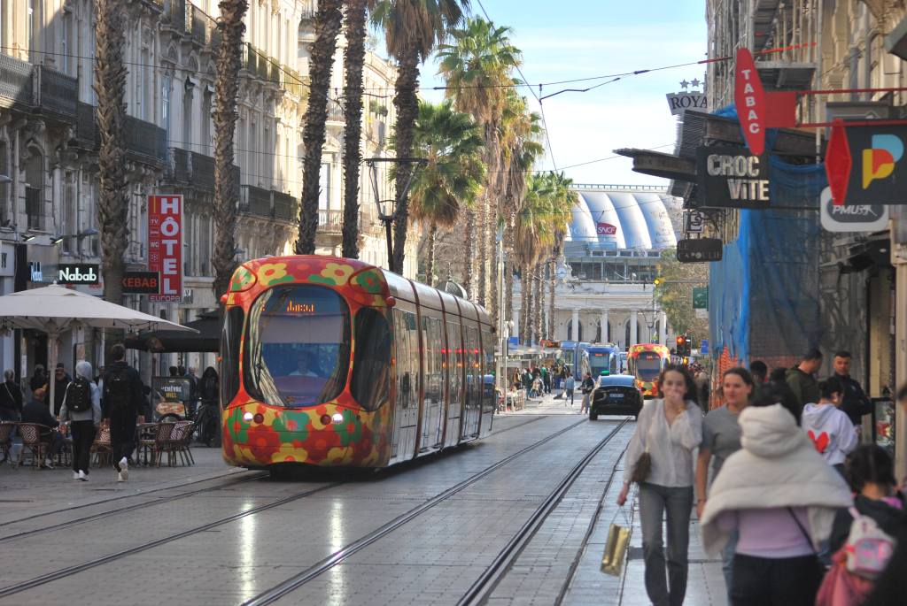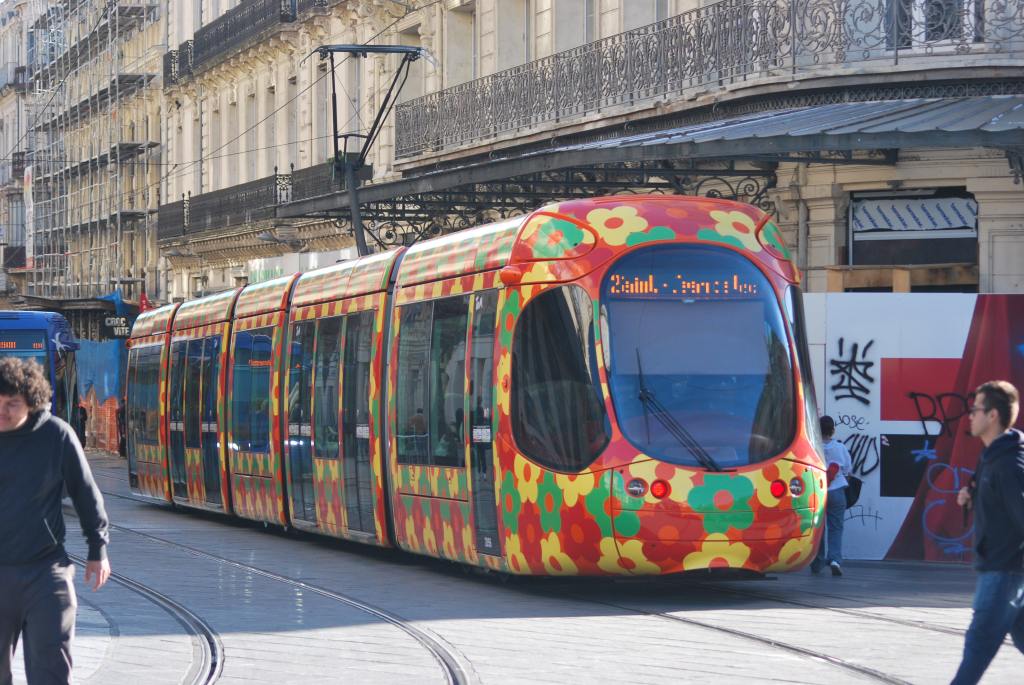 So, leaving the grand artist – Mother Nature – behind, we cycle to the Number 3 tram stop into Montpellier in Lattes. The numbers 3 and 4 have interiors designed by Christian LaCroix. The trams in Montpellier are worth a trip in themselves, they are works of art, each line themed differently, be it literary, marine, natural or technologically inspired.