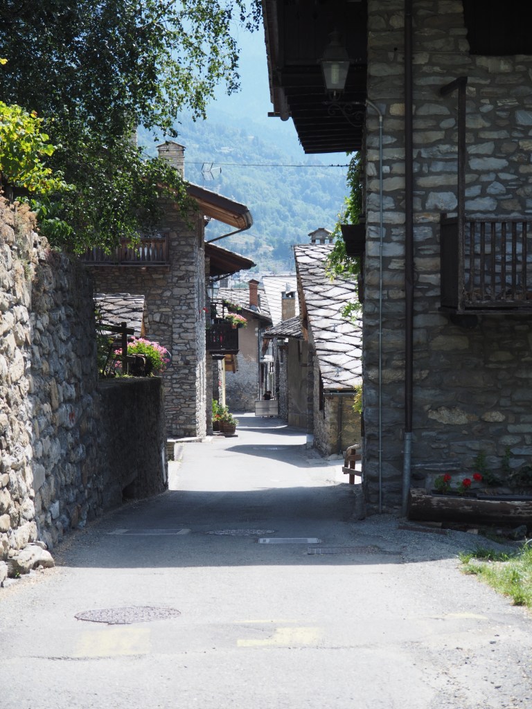 Morgex town is magical, with its narrow alleys, thick granite slate roofs, and sturdy houses, with wooden balconies festooned with geraniums.