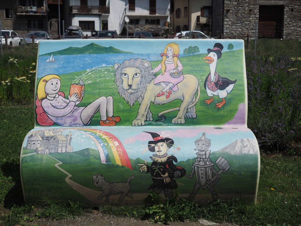 Down by the old station we mooch around the literary park for children, an innovative idea of a park on the theme of reading, complete with open book benches of Dorothy on the yellow brick road and Jules Verne’s voyage under the sea as well as a book maze.