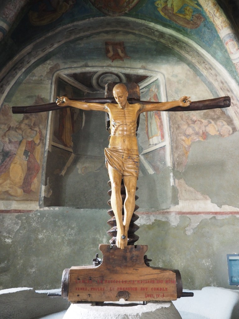 The Chatelard turret towers up above the trees, guarding entrance to the valley as it has always done. Lone chapels mark the wayside. We sit by a carved face of the Madonna in a tree stump before descending to La Salle itself.