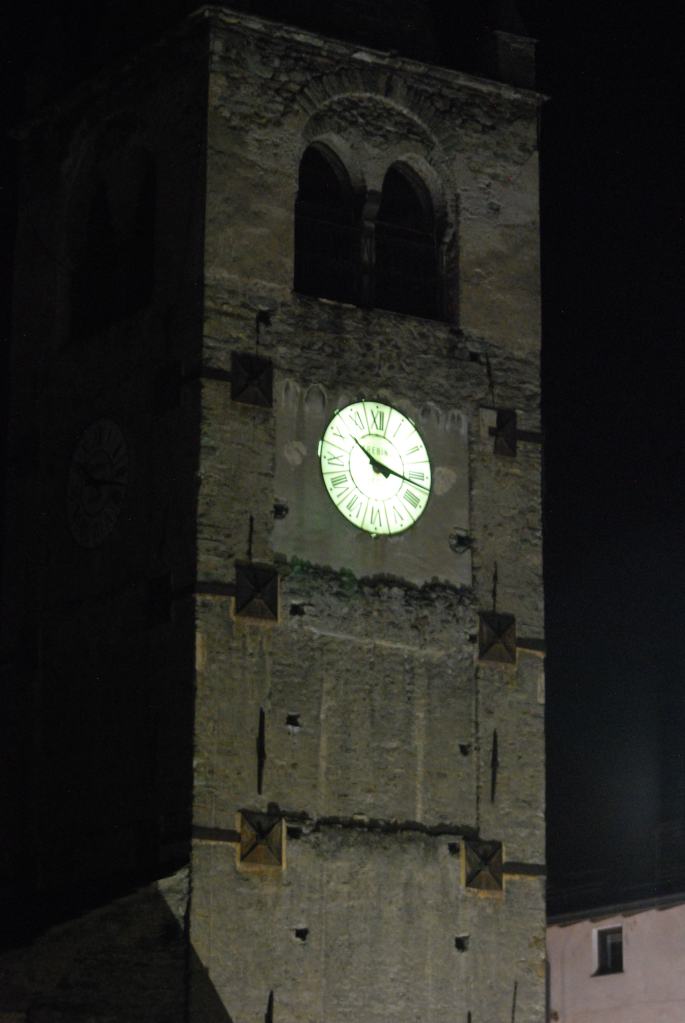 After seeing Pina to the bus-stop, we walk back to the campsite the long way through the cobbled centre of St. Vincent, past an open-air game show, to the illuminated St. Vincent church, the foundations being the remains of a Roman villa and the Medieval frescoes still showing on the external walls in parts.