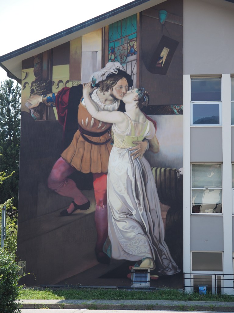 At first it seems a pretty ordinary town, despite the grand palazzos from previous eras, now banks and pharmacies, covered in geometric frescos, with towers and imposing facades. Despite too the massive mural of Romeo and Juliet’s last kiss, by Andrea Ravo Mattoni, based on a painting by Francesco Hayez – which stands opposite the supermarket of all places.
