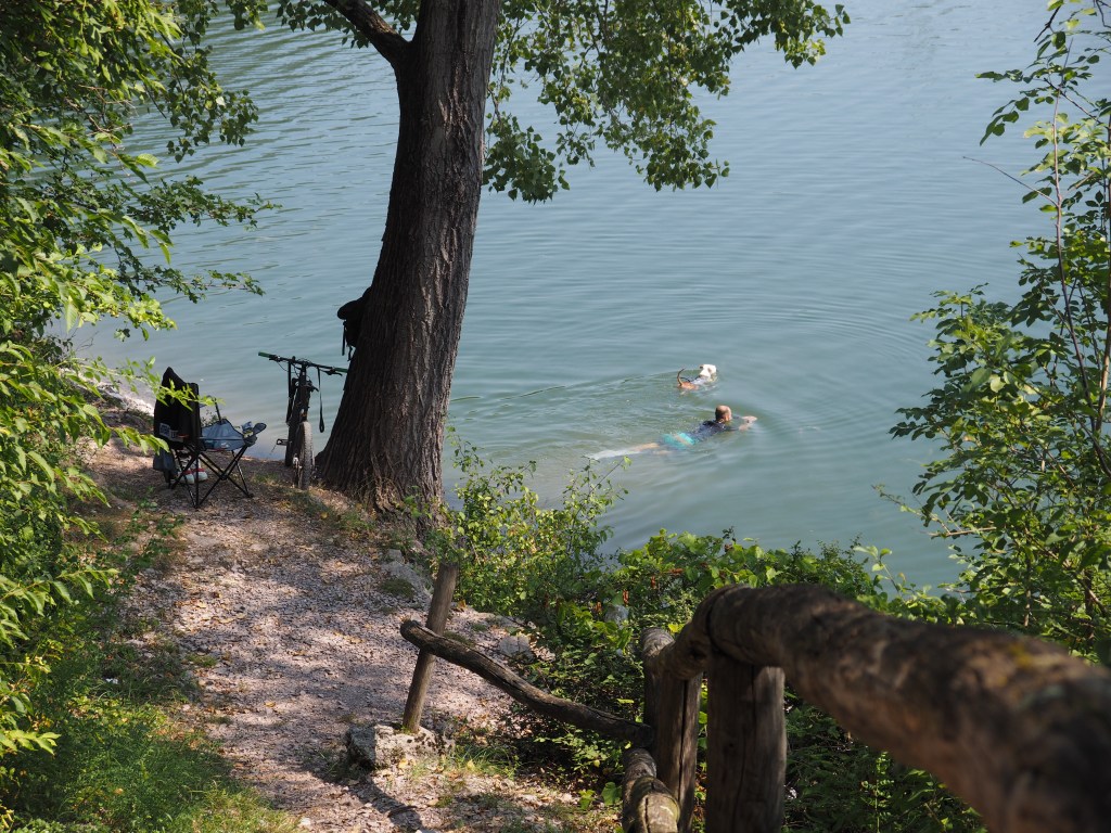 We spend some contemplative minutes watching the tiny fish swarming in the clear water, water boatmen row and dragon flies dart. A woman paddleboards, two swimmers enjoy an isolated cove, the small picnicking crowd confine themselves to the one beach bar. A water skier is winched over ramps and across the lake by an ingenious hi-wire set up.