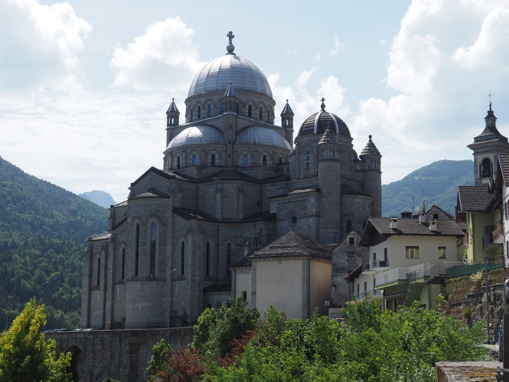 As we cross the border back into Italy, we come to a halt at a church’s massive domes at the entrance to an unspoilt Alpine village. We have to see this church as its spectacular, dwarfing the stone houses clustered below it.