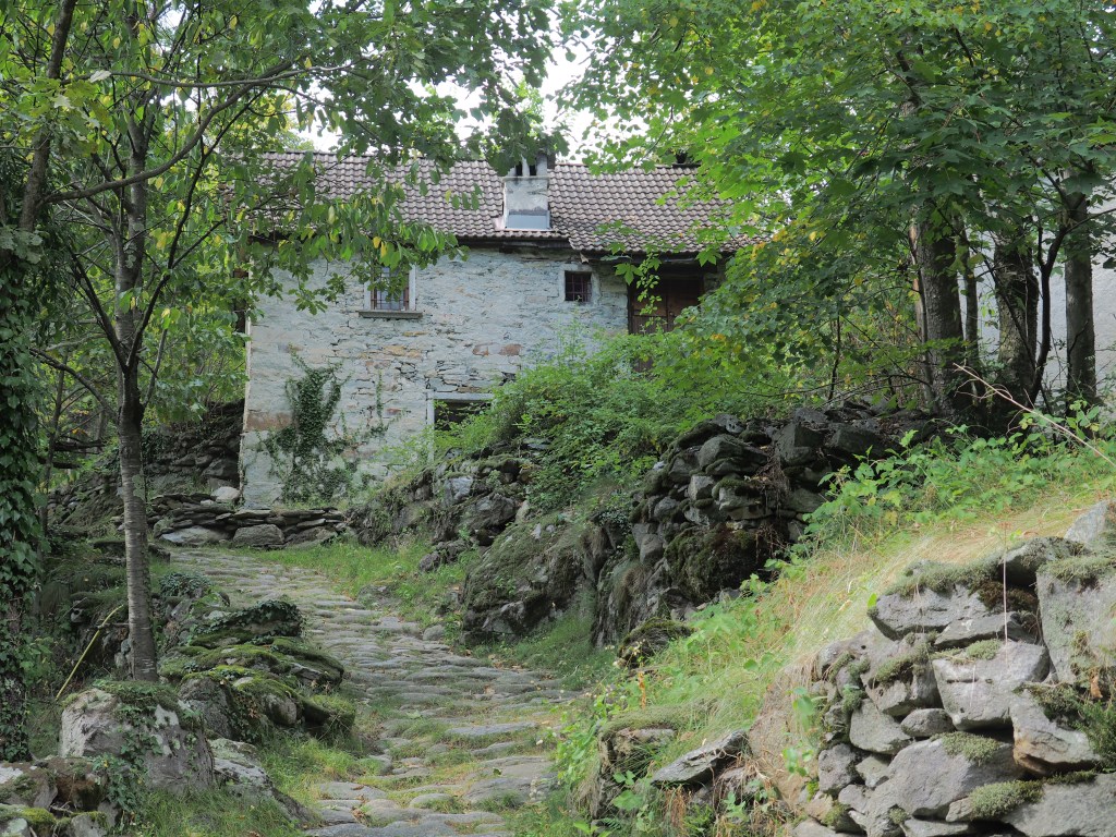 We follow the mountain walking trail up an ancient cobbled pathway, by chickens rooting in the earth, over a stone arched bridge, the river sparkling below, through the woods, to Baceno’s stunning San Gaudenzio church.