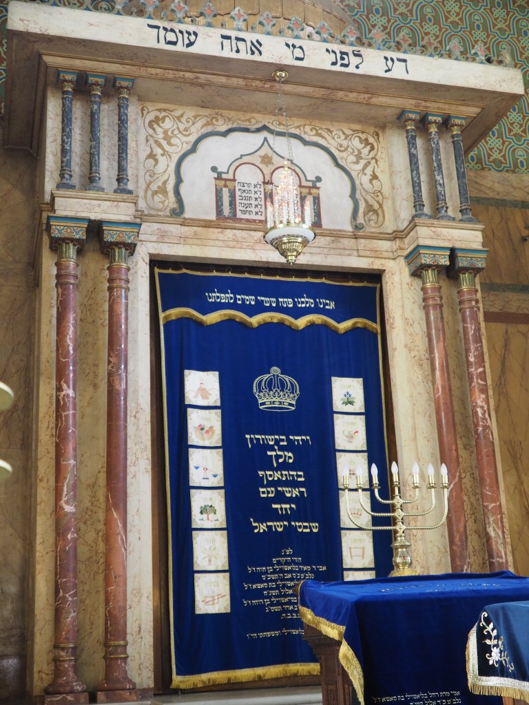 The next morning, 500 metres from our hotel, we stumble across the Central Synagogue of Sofia, the biggest Sephardic synagogue in Europe. We pass the two machine-gun toting policemen outside, go through a metal detector before we pay our 10 Leva each (about £4). The round building has geometric patterned arched apses and the heaviest chandelier in Bulgaria.