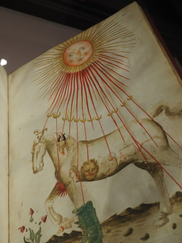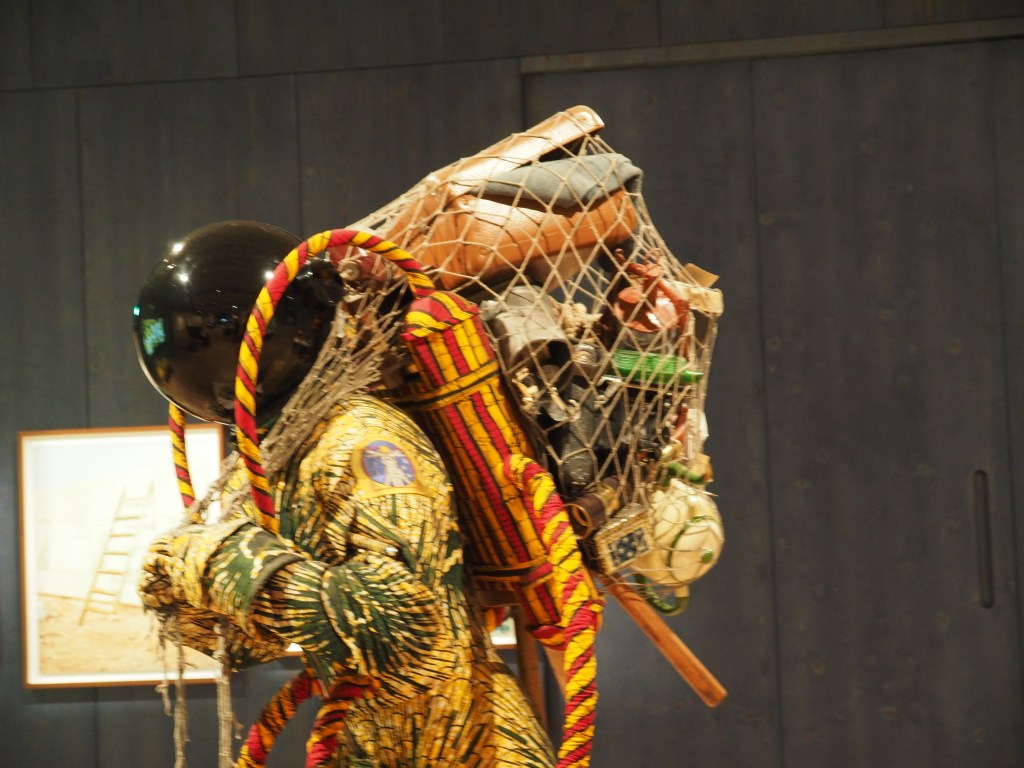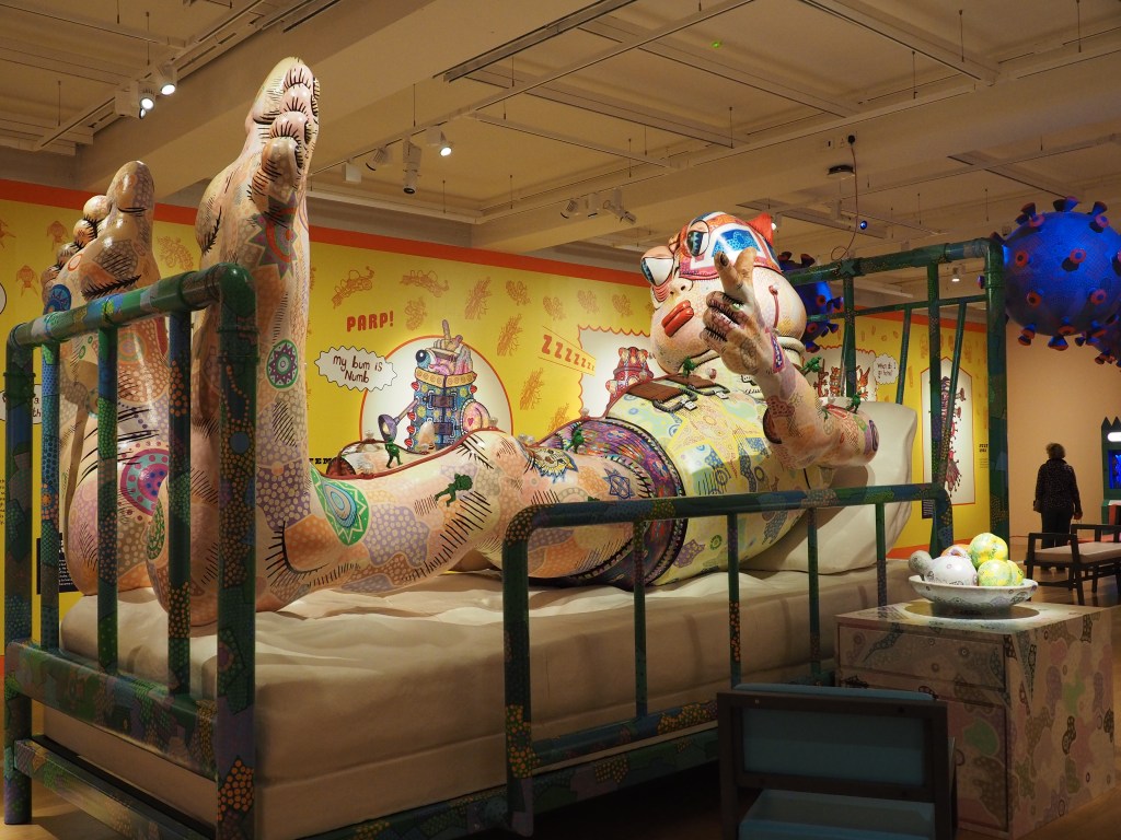 Across Euston Road, we sashay into the free entry Wellcome Institute. Apart from the permanent galleries, each month hosts a new exhibition. This month’s exhibition of cartoon characters and giant, multicoloured sculptures is testament to the resilience and courage of a young man, Jason Wilsher-Mills who spent years in hospital due to an autoimmune condition that paralysed him from the neck down. It was in hospital school he learnt how to paint with his mouth, unleashing his creativity, and this installation is the result.