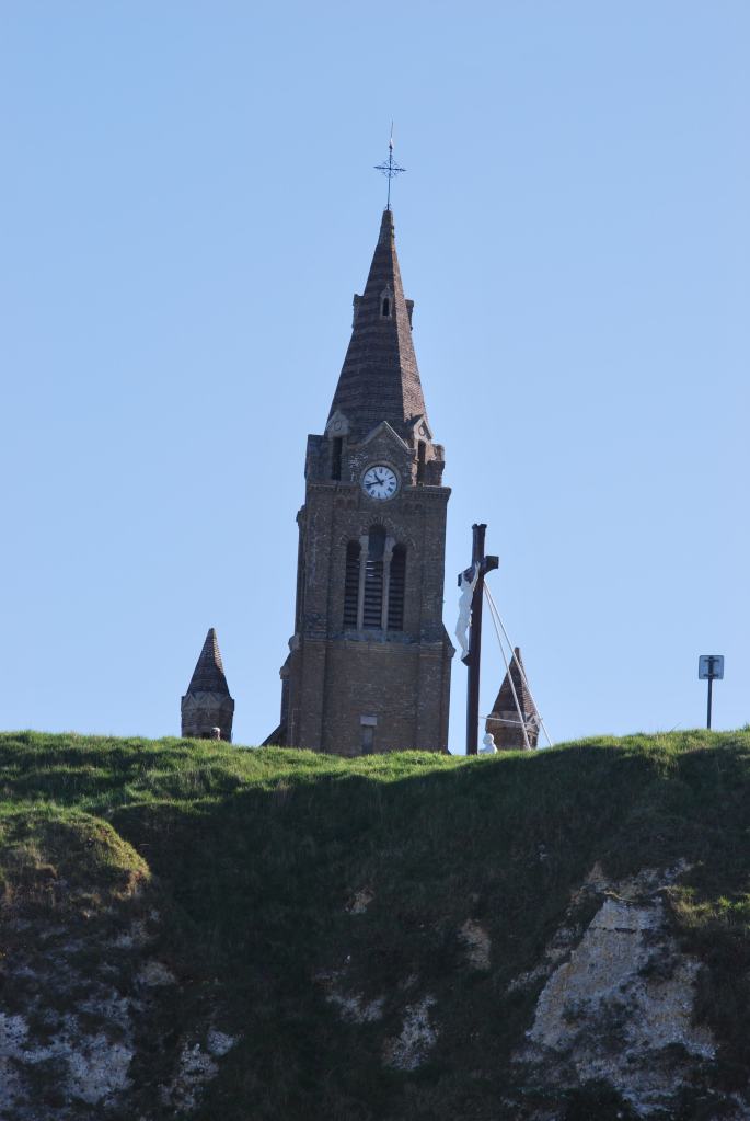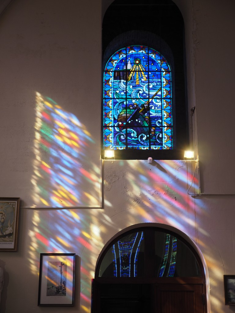 Inside, I can never fail to be moved by the book of all the sailors lost at sea. As we read the plaque about the liberation of prisoners of war in 1944 by Canadian troops, an elderly man enters, his face lined, his eyes sad. He lights a candle. Just at that moment the sun pours through the stained-glass window throwing a kaleidoscope of colours onto the white wall. I can’t help wondering whether he lost someone close to him, or whether he just likes to pay his respects to all the names recorded in the big book.