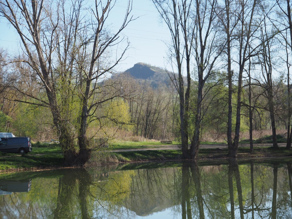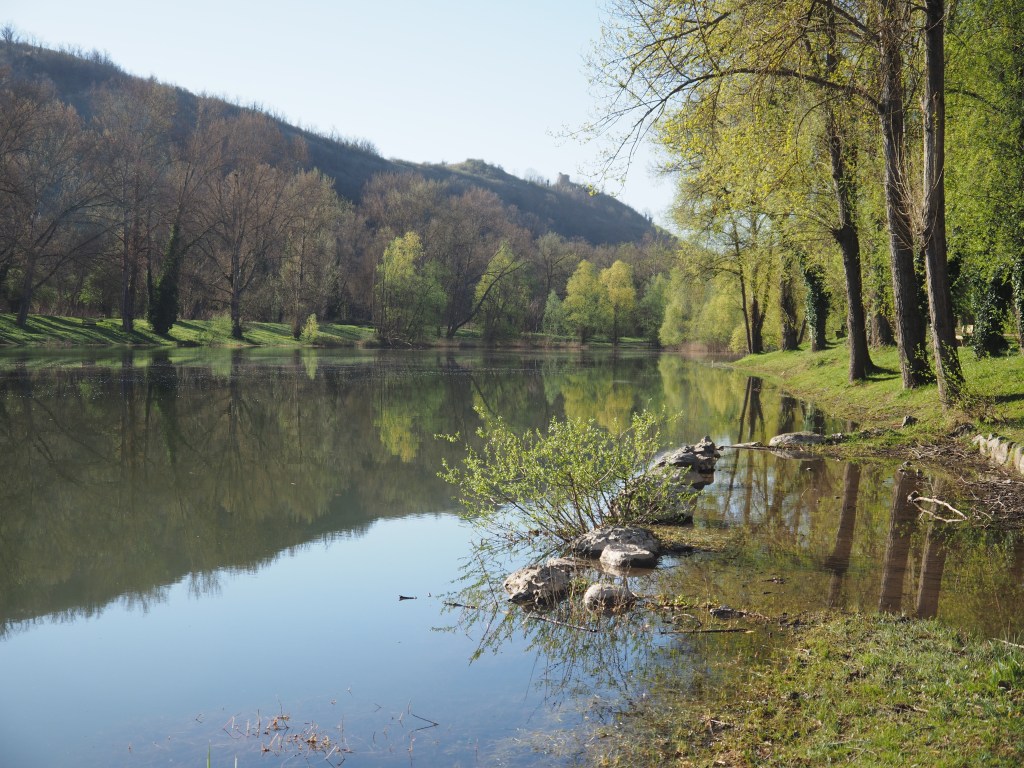 We catch up with our friends, Mary and Martin, and their sheep of a dog, Luna, in Issoire in the Puy de Dome region, at Camping Du Mas, surrounded by the cones of extinct volcanoes, by a lake and the Allier River. In the distance, there’s the snow-striped conical mountains.