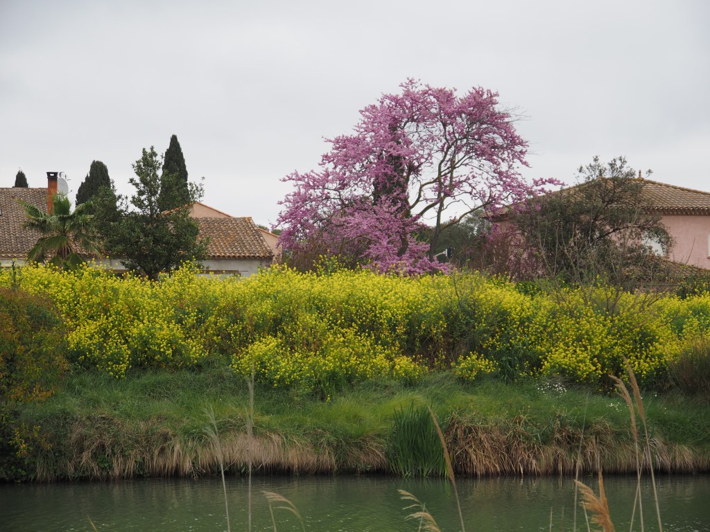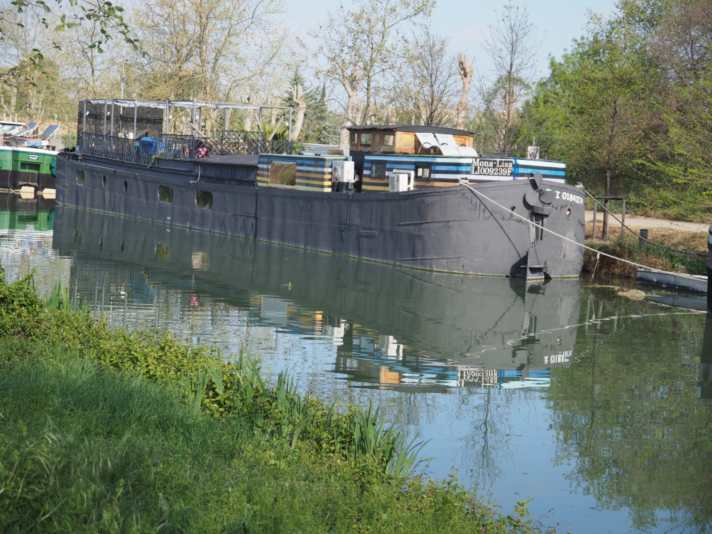 In Villeneuve-lès-Béziers at canalside Camping Les Berges Du Canal, we choose a pitch facing a vineyard. Strolling by the plane-tree edged canal, watching the ducks swimming and the canal boats, we luxuriate in the warm sun and fresh breeze. Even better, we can walk into Béziers along the side of the canal tomorrow to have a little poke around before we head for the border into Catalonia.