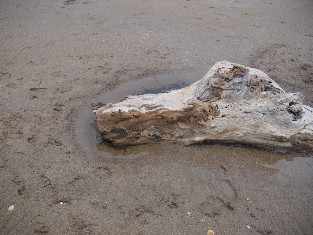 We follow cycle paths to the Plage du Bosquet and watch a woman beachcombing, the sand full of multicoloured shells, and huge tree trunks, scoured by wind, salt, sand. One looks like a dragon’s head, complete with nostrils, staring eye and wide grin.