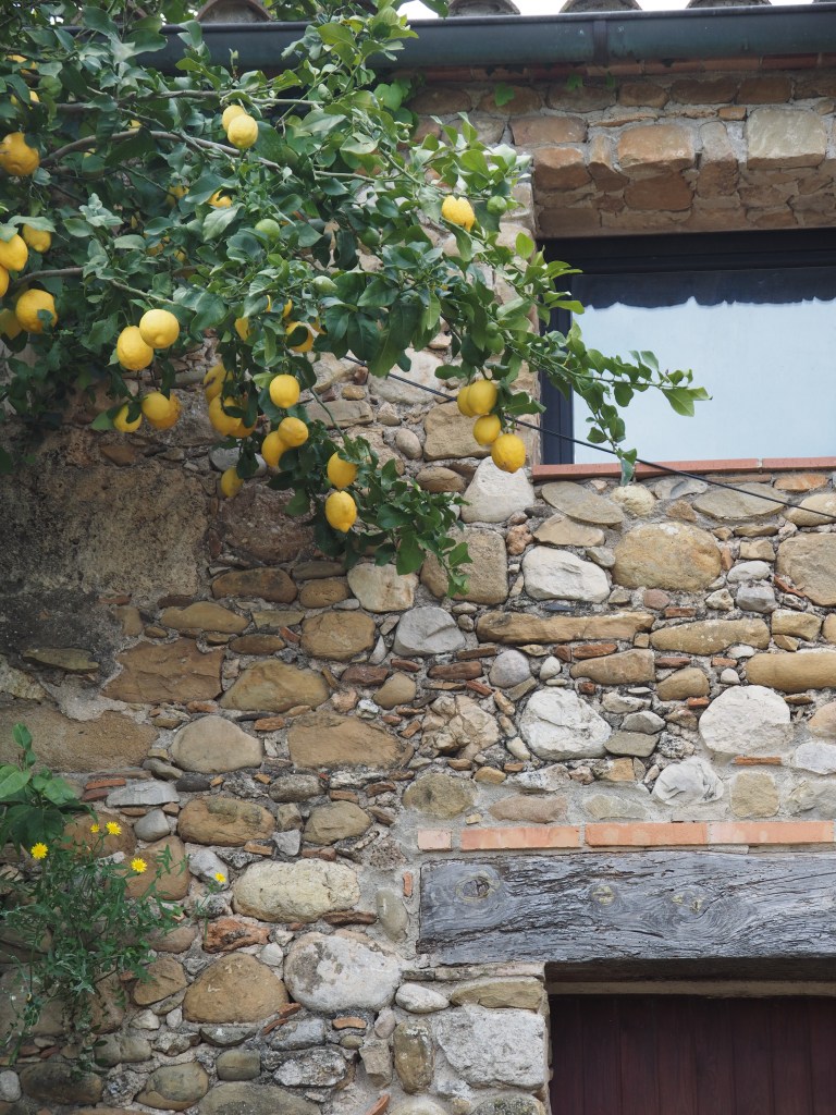 We wander around the ancient village, the handsome houses, with arched doors big enough to ride your horse inside, complete with mounting blocks by the entrance. The columnated balconies remind me of Romeo and Juliet. Lemons and oranges shine like baubles from trees in courtyards.