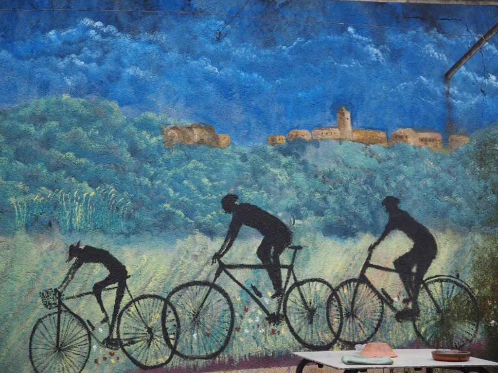 Drinking coffee on the little bakery’s terrace is accompanied by the baker giving us a gift of fresh croissants, the plane trees above us pollarded so that their branches touch and I can imagine the glorious shade in summer. A mural of the town and cyclists fills the wall. The campsite restaurant serves up pumpkin and parmesan croquetas, an unctuous confection hard to resist during our three-night stay.