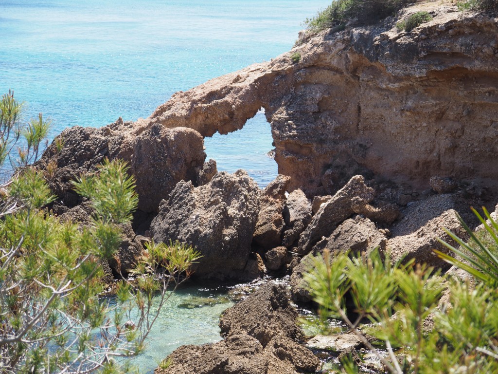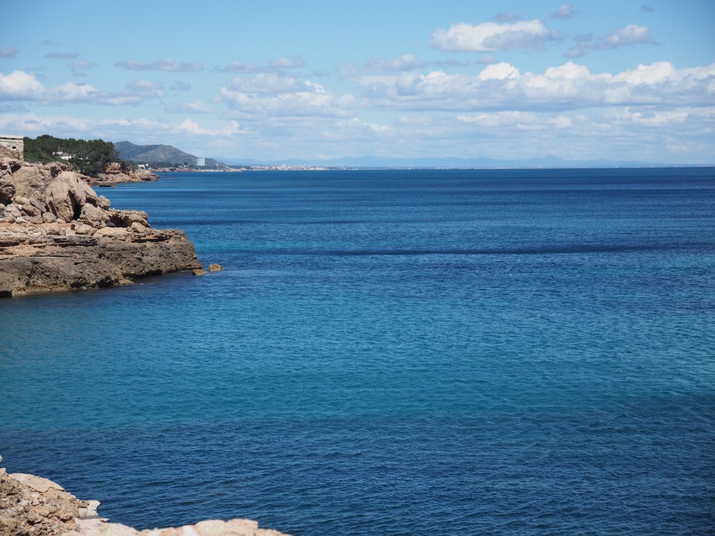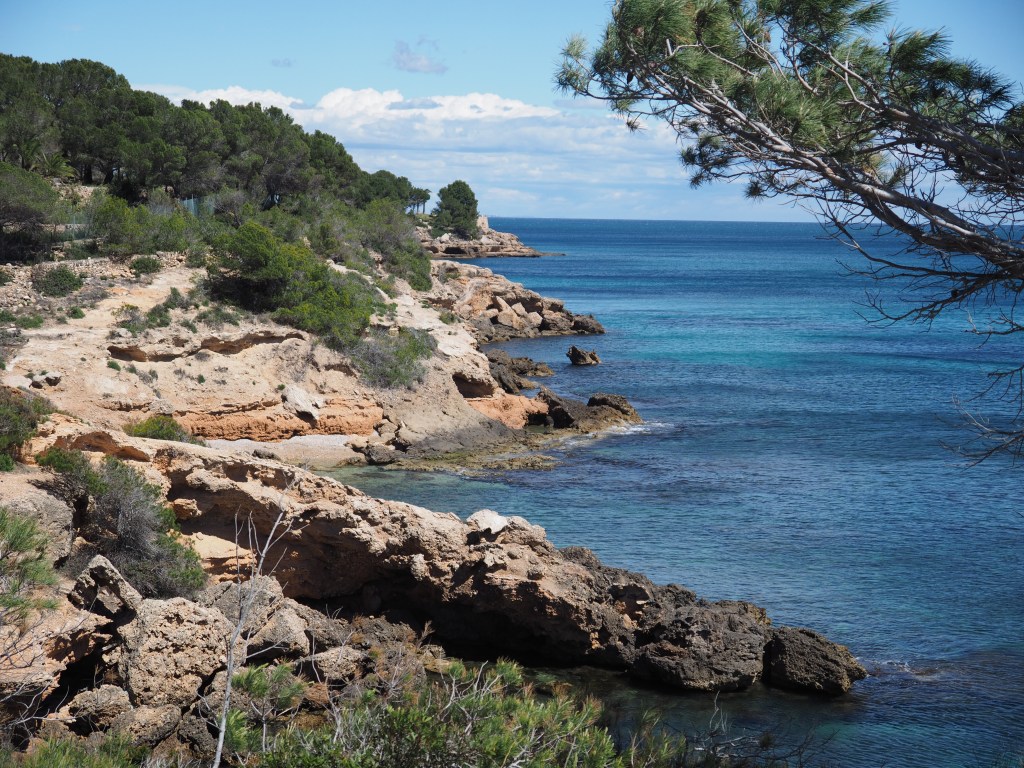 Our first glimpse of L’Ametlla is not a postcard pretty one, the AP7 motorway and railway run against the back of the town and concrete apartments. But the minute we see Camping Nàutic we’re won over. The terraced campsite is shaded by Mediterranean pines and olives, and it looks out on a sea that deserves painting. Turquoise waters turn to indigo where protected fields of Poseidon grasses grow.