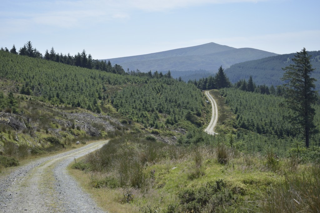 The mountains are purple-brown in the distance, the heather just starting to bloom, but the forested slopes are patchworked with wild-felled sections, which look like trench warfare has come to Wicklow.
