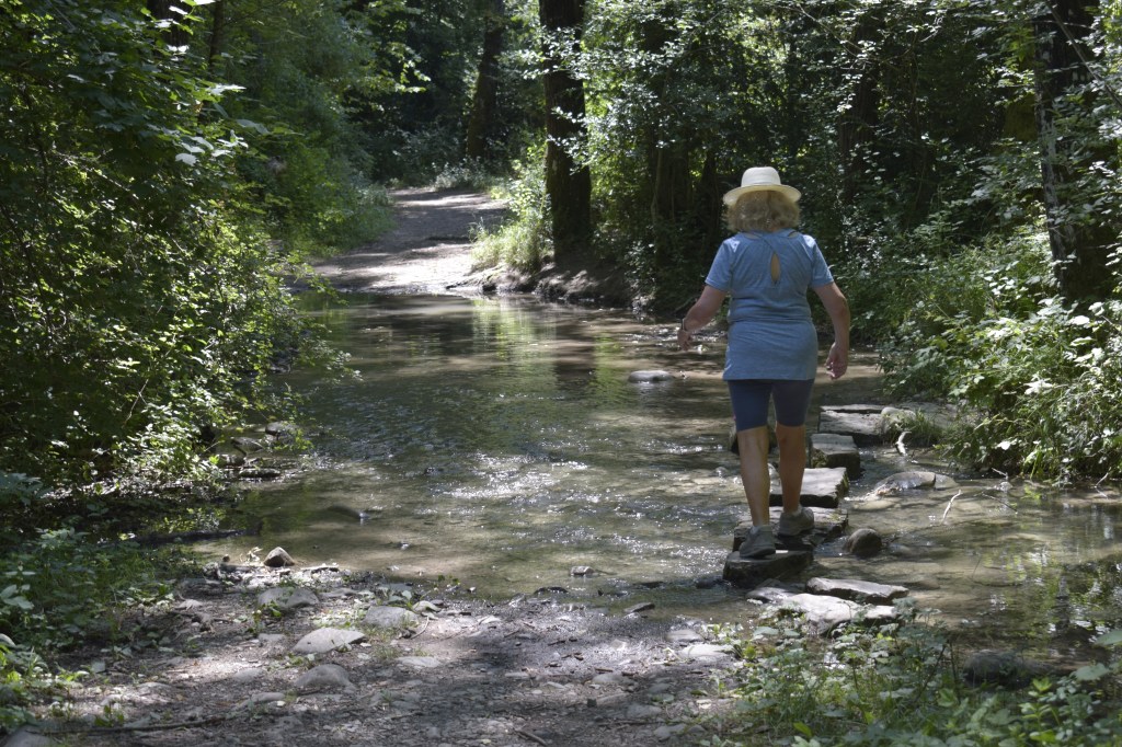 We walk along the banks of the river, through oak and pine forests, wild thyme throwing up its scent under our feet. The ancient track is crossed by clear streams, with stepping stones over them and I can’t resist bathing my feet in the cool water.