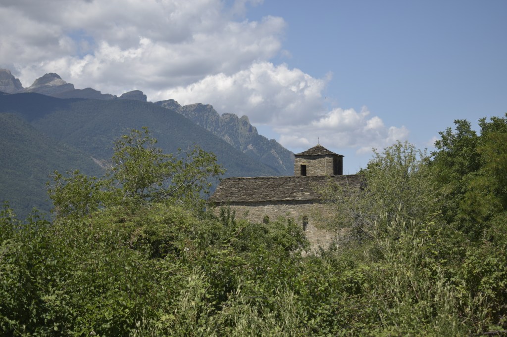 Biesca’s alleys are lined with stout mountain houses, with steps taking us up to the churches which look down on the roofs and people below.