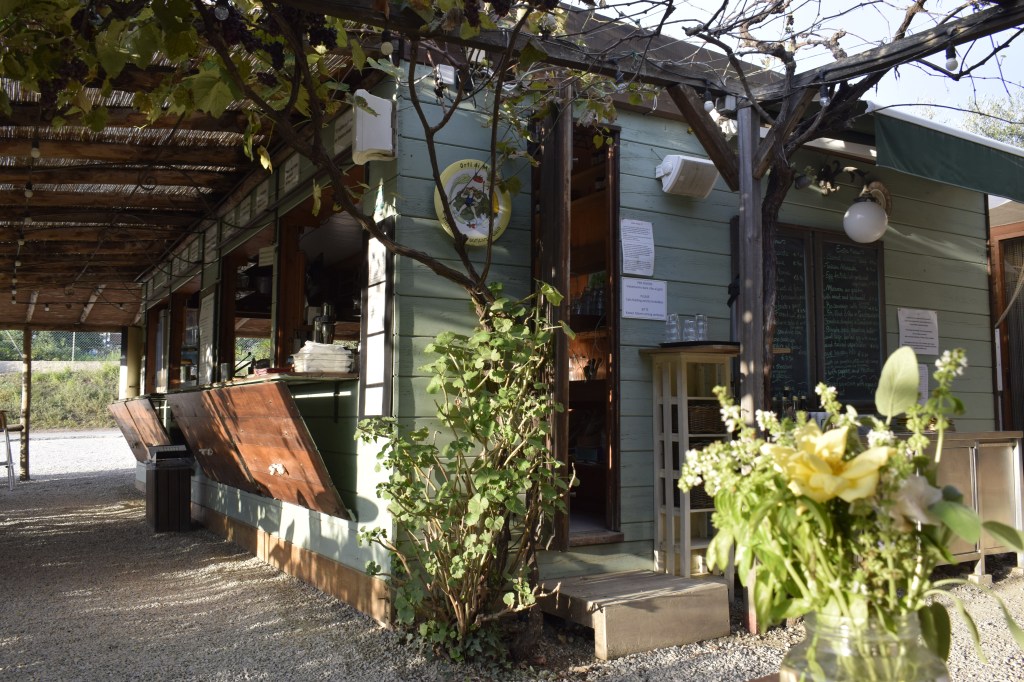 The dining area has mismatched brightly painted kitchen chairs and sturdy wooden tables. Above us hangs an ancient, fat purple-grape vine.