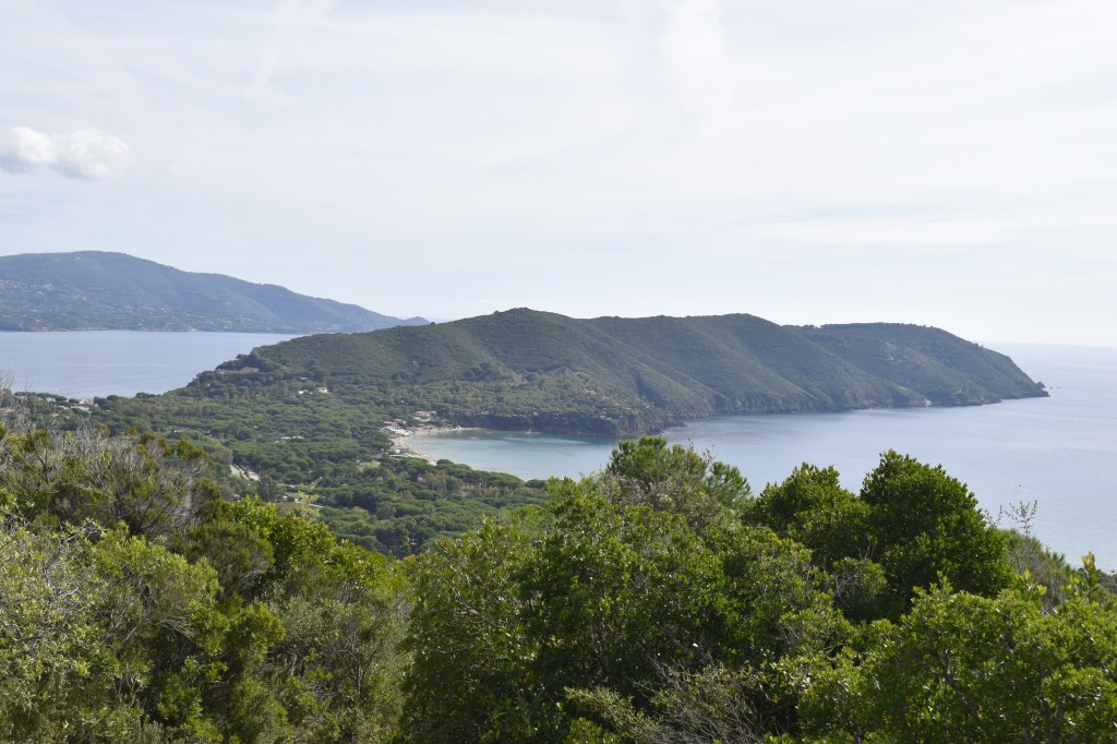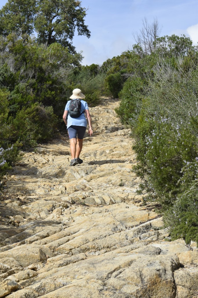 The view is worth the climb. Monte Cristo’s volcanic cone seems to float way out on the blue sea; the cliffs are russet rock, the wooded slopes impossibly green with umbrella pines. The reddish trunks and scarlet fruits of the strawberry trees are yet another delight for the senses. Another of Seán’s favourite apps, Merlin, tells us that we’re listening to the Eurasian black cap, and the European robin sing.