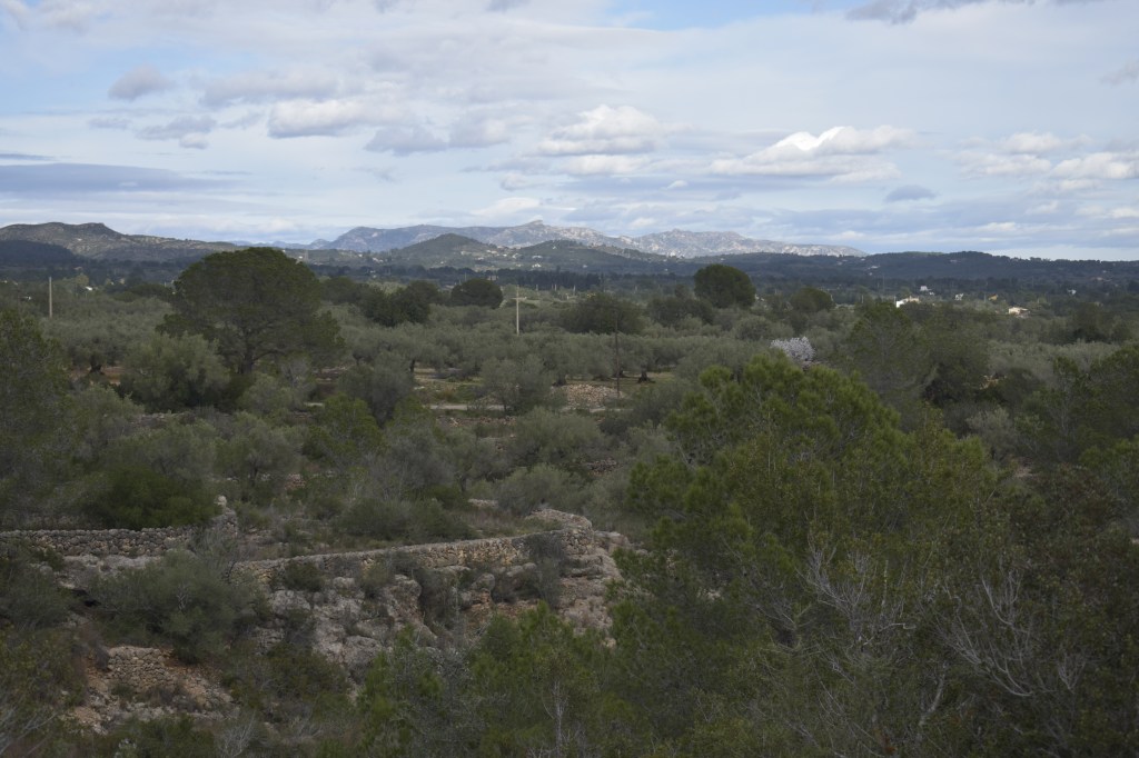 We cycle along a circular route from the promenade in L’Ampolla through the hinterland, following the olive grove route. The road is a rollercoaster. Sun shines on mountains terraced with dry-stone walls.