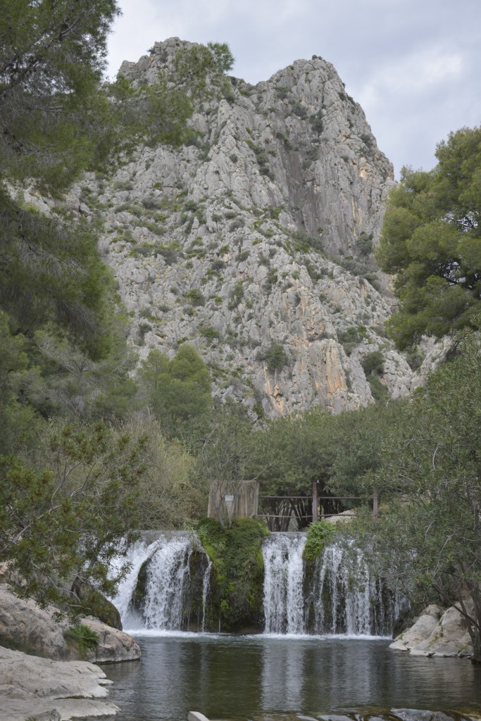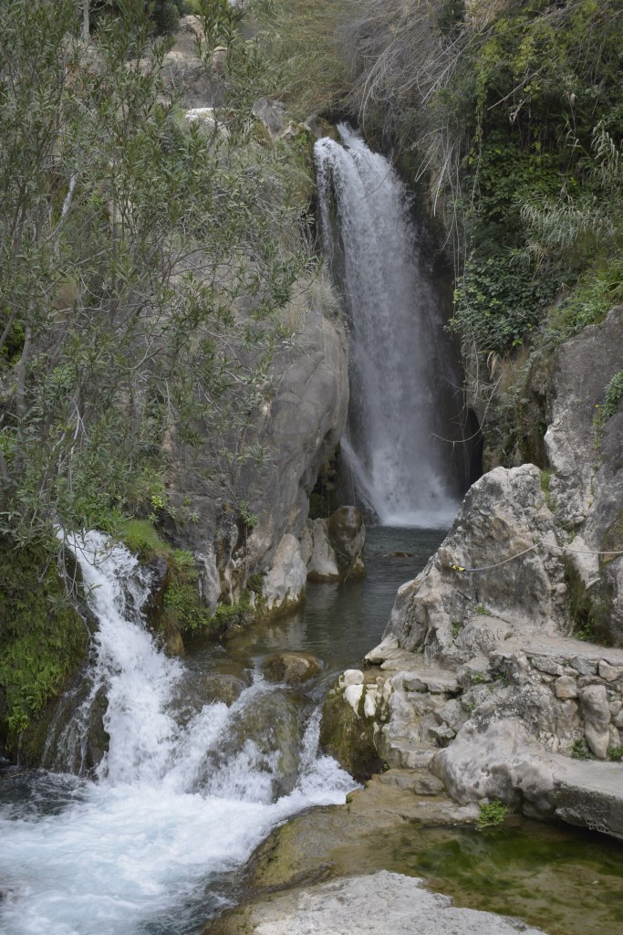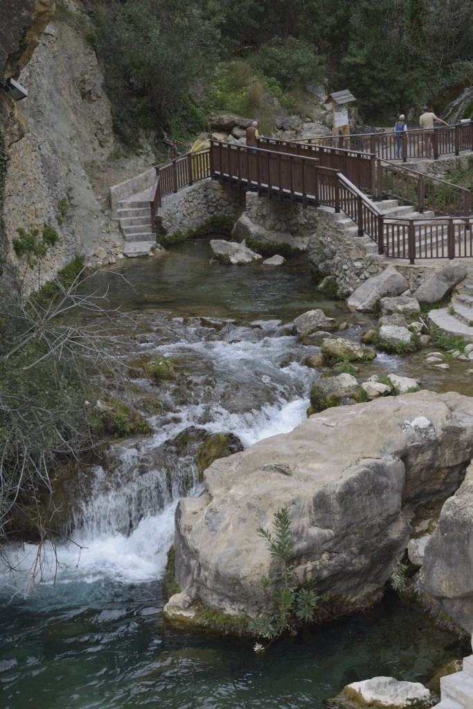 Sheer drops send us back down the track to Les Fonts d’Algar, a series of waterfalls which emerge from the limestone karst and from underground aquifers, resulting in unusual vegetation for these sun-parched mountains, such as the maidenhair fern, and blue throatwort (another wonderful name). Demoiselles and dragonflies, kingfishers and water snakes love the clear racing water.