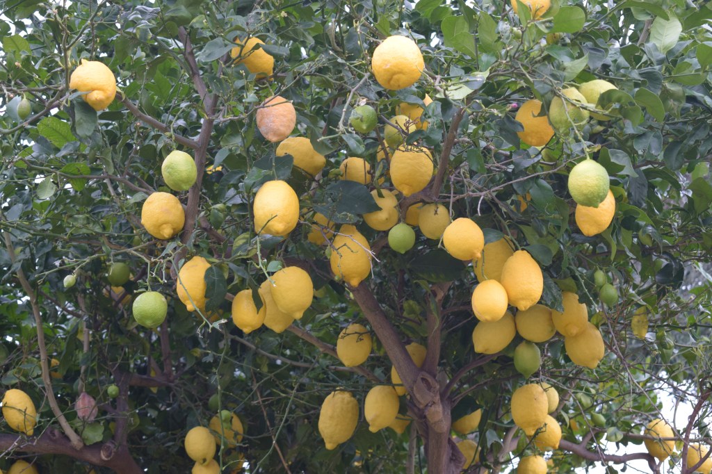 The next day, we walk through trees weighed down with fat lemons and oranges shining like baubles.