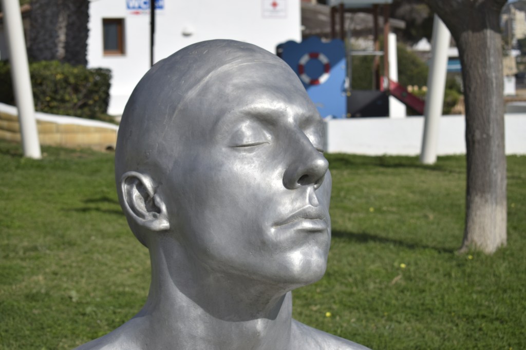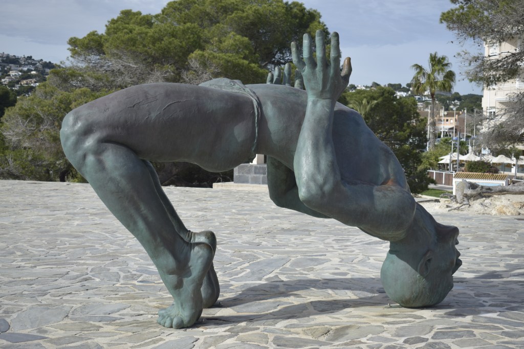 We ramble out and I’m delighted, as usual, with the free, outdoor sculptures. I love the egalitarian aspect of bringing art out of galleries and serving it up to any stray rambler. All Moraira’s current bronzes are by Coerch and Malavia. The Swimmer is first on the promenade, the description telling us of how it reveals the meditative communication of humans with the sea, the importance of savouring the present moment. The closed eyed beautiful head looks contemplative.